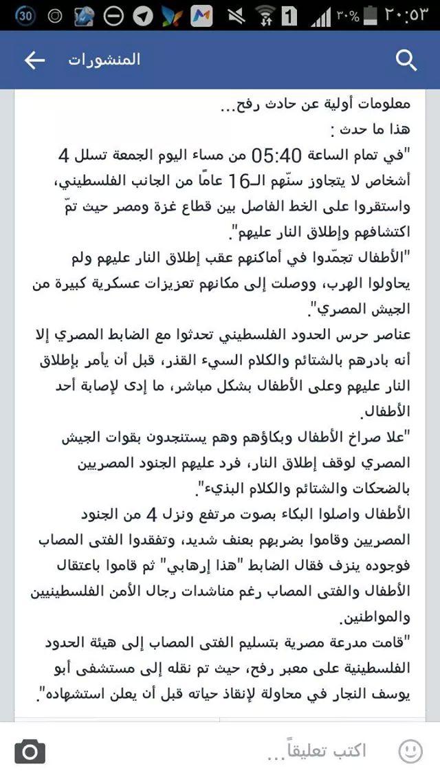 والد الشهيد زكي خلال حديثه لـ"فلسطين الآن" يصف حاله عندما استقبل نبأ ابنه ويقول:"لم أقدر أن أتحمل عندما سمعت الخبر, خصوصاً أنه من الجانب المصري, كان خبر سيء جداً".