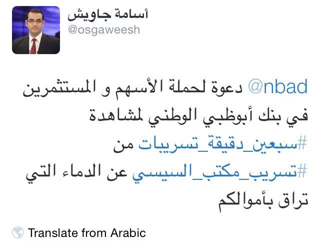 وأكد في تغريدات أخرى، أن آل نهيان – حكام أبوظبي – انكشفوا للجميع باعتبارهم الوكيل الرئيسي وراء إفشال ثورات الربيع العربي، مشيرا إلى أن العسكر في مصر حولوا مصر إلى الإمارة الثامنة لآل نهيان، مبينا أن المندوب السامي الإماراتي يدير مصر من مكتب السيسي، حسب تغريداته.