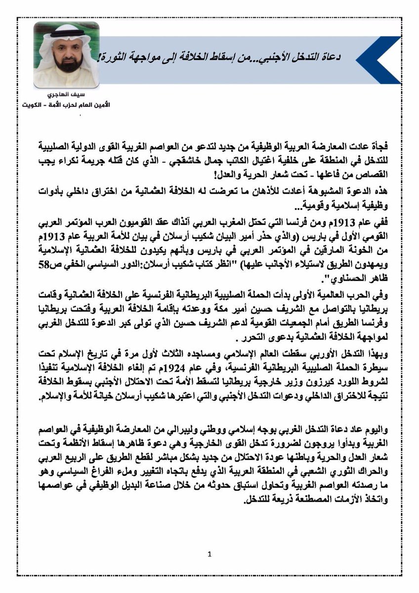 إن خطورة الدعوة للتدخل الأجنبي في أي بلد عربي أو إسلامي وخصوصا في السعودية إذ هي أشد خطر كونها تعرض الحرمين الشريفين في مكة والمدينة للخطر وللوقوع المباشر تحت النفوذ الغربي على نحو أشد مما حدث في الحرب العالمية الأولى وستعرض كافة الشعوب في الخليج والجزيرة العربية للحرب والتدمير والتقسيم ونهب لثرواته كما صرح بذلك الرئيس ترامب بكل وضوح وهذا هو ما تسعى إليه القوى الدولية ضمن خطة غرفة العمليات الدولية المشتركة لمواجهة الثورة العربية من خلال العمل على فتح الطريق للتدخل الأجنبي لتقسيم دول المنطقة وتجزئتها ونهب ثرواتها وضرب مقومات النهضة في العالم العربي لقطع الطريق على نجاح الثورة العربية وتحرر الأمة وبأيدي أدوات وظيفية كما فعلوا من قبل عندما أسقطوا الخلافة العثمانية الإسلامية!