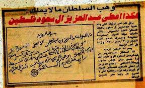هذه وثيقة تاريخية توثق بيع ارض فلسطين،بخط يد الملك عبد العزيز آل سعود مؤسس المملكة،مقابل عرش آل سعود،من أعطاه حق بيع ما لا يملك؟