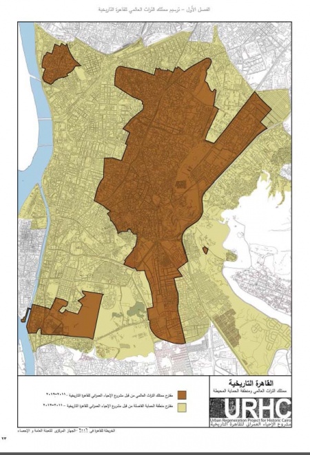 وبينما كان المصريون منشغلين بالدستور والانتخابات أصدرت اليونسكو تقريرها الأول عن “مشروع الإحياء العمراني للقاهرة التاريخية” في يونيو 2012 أوضحت فيه أن حدود ممتلك التراث الإنساني للقاهرة تبدأ من القلعة والمقطم شرقا حتى الضفة الشرقية لنهر النيل غربا، ومن رمسيس وميناء بولاق القديم شمالا إلى الفسطاط جنوبا، وتضمن التقرير خريطة توضح المناطق الأثرية باللون البني وباقي القاهرة المعاصرة باللون الأصفر وأطلقت عليها “منطقة الحماية الفاصلة” انظر الخريطة المرفقة