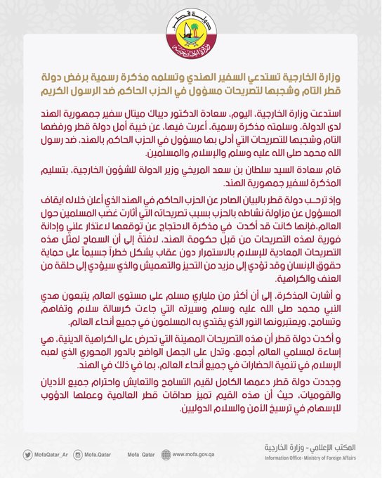ويستدرك الكاتب قائلًا: غير أن الانتقادات التي أعربت عنها بلدان إسلامية كانت شديدة؛ ما يشير إلى أن الإساءة إلى النبي محمد خط أحمر. وقالت وزارة الخارجية القطرية إنها تتوقع أن تصدر الحكومة الهندية اعتذارًا علنيًّا، وحذَّرت الكويت من أنه إذا مرت هذه التصريحات دون عقاب فستشهد الهند «زيادة في أعمال التطرف والكراهية». ووصف مفتي عمان «الوقاحة الفاحشة» التي ارتكبها حزب مودي ضد الإسلام بأنها تُمثِّل شكلًا من أشكال «الحرب».