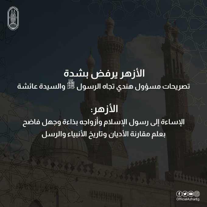 وأكَّدت الرياض أن هذه التصريحات مسيئة، ودعت إلى «احترام المعتقدات والأديان». كما وصف الأزهر الشريف في مصر، وهو أبرز مؤسسة معنية بتدريس التعليم الإسلامي في العالم السُنِّي، هذه التصريحات بأنها تُمثِّل «الإرهاب الحقيقي بعينه، الذي يمكن أن يُدخِل العالم بأسره في أزمات قاتلة وحروب طاحنة». وتهدد التصريحات التي أدلت بها نوبور شارما خلال برنامج تلفزيوني في الهند، والتي غرَّد بها جندال بإلحاق الضرر بعلاقات الهند مع بلدان عربية.