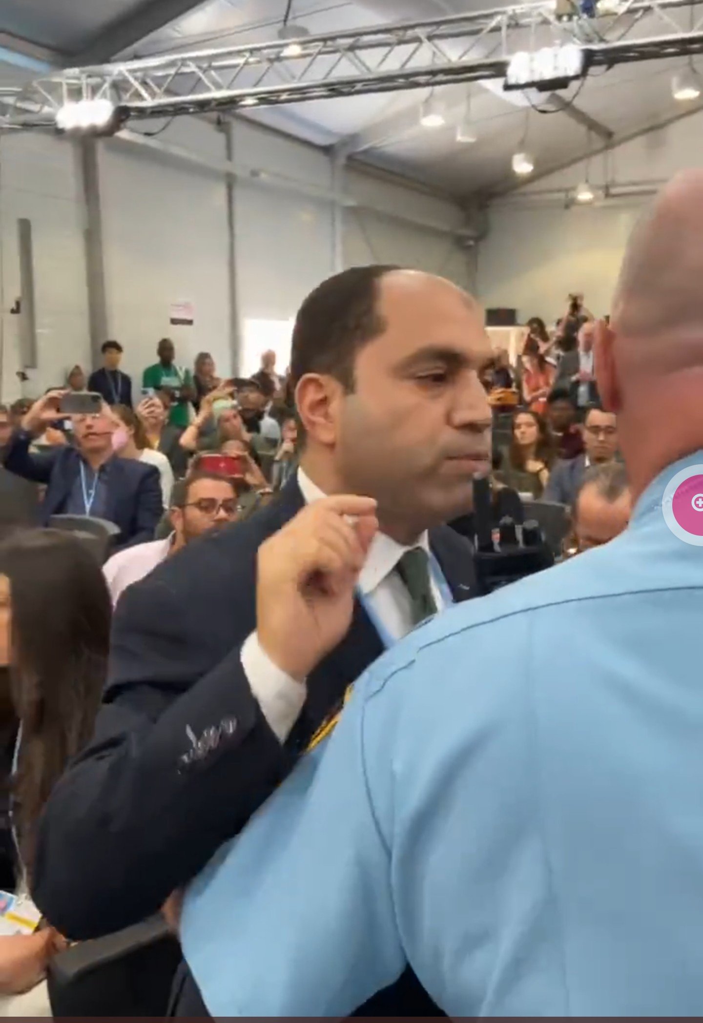 حاول التطبيل وإسكات ضيوف تحدثوا عن انتهاكات حقوق الإنسان في مصر، خلال مؤتمر المناخ، فطرده رجال أمن أجانب من القاعة..