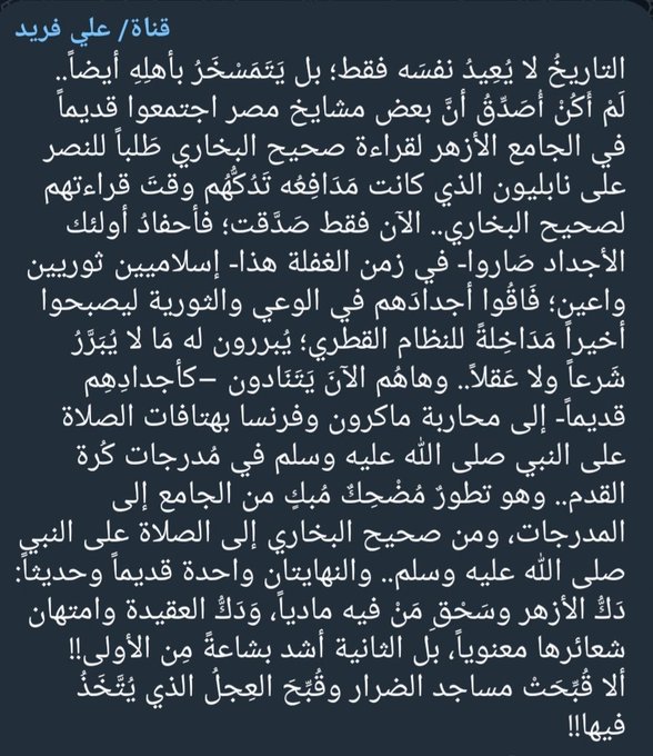 لَمْ أَكُنْ أُصَدِّقُ أنَّ بعض مشايخ مصر اجتمعوا قديماً في الجامع الأزهر لقراءة صحيح البخاري طَلباً للنصر على نابليون الذي كانت مَدَافِعُه تَدُكُّهُم وقتَ قراءتهم لصحيح البخاري.. الآن فقط صَدَّقت؛ فأحفادُ أولئك الأجداد صَاروا- في زمن الغفلة هذا- إسلاميين ثوريين واعين؛ فَاقُوا أجدادَهم في الوعي والثورية ليصبحوا أخيراً مَدَاخِلةً للنظام القطري؛ يُبررون له مَا لا يُبَرَّرُ شَرعاً ولا عَقلاً.. وهاهُم الآنَ يَتَنَادون –كأجدادِهِم قديماً- إلى محاربة ماكرون وفرنسا بهتافات الصلاة على النبي صلى الله عليه وسلم في مُدرجات كُرة القدم.. وهو تطورٌ مُضْحِكٌ مُبكٍ من الجامع إلى المدرجات، ومن صحيح البخاري إلى الصلاة على النبي صلى الله عليه وسلم.. والنهايتان واحدة قديماً وحديثاً: دَكُّ الأزهر وسَحْقِ مَنْ فيه مادياً، وَدَكُّ العقيدة وامتهان شعائرها معنوياً، بل الثانية أشد بشاعةً مِن الأولى!!