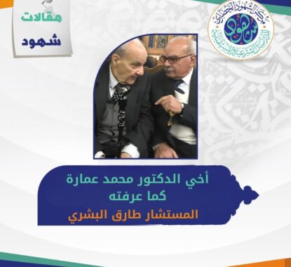 بقلم المستشار: طارق البشري(*)الدكتور محمد عمارة: أخُ وصديقُ، جمعتنا الأُخوَّة والصداقة لمدىً زمنيٍّ يصل أو يشارف نحو نصف القرن، منذ بداية السبعينيات من القرن العشرين.. وحتى إن باعدت بيننا ظروف المعيشة وأحوال الزحام القاهري والتقدم في السن عن اللقاءات في السنوات الأخيرة، فإن القرابة الوجدانية والمحبة والتقدير والاحترام، مع الشعور بالانتماء الفكري المشترك وبالصحبة القلبية، إن ذلك كله يُبْقِيني معه على لقاءٍ مستمر وصُحبةٍ باقية؛ إن شاء الله تعالى.